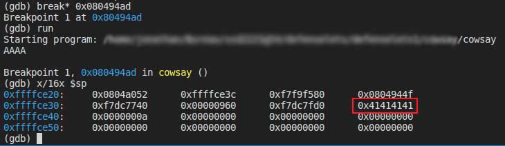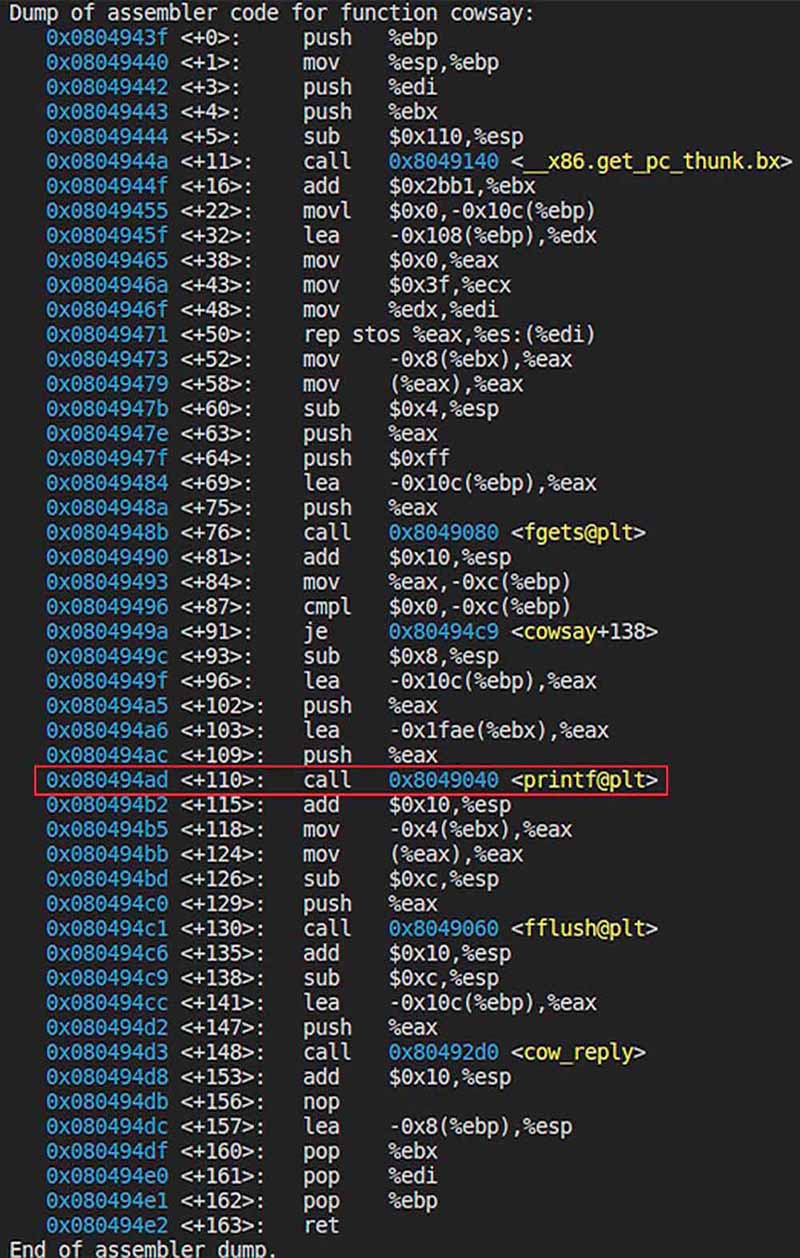 Sur un programme de type "Cowsay", l'objectif était de rediriger le flux d'exécution pour appeler une fonction secrète old_cowsay_please_dont_use.