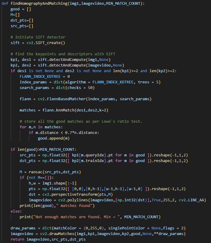 Détection d'objets réels sans marqueurs (Feature Matching) et projection 3D. Algorithmes : SIFT (Scale-Invariant Feature Transform) et RANSAC pour éliminer les faux positifs.