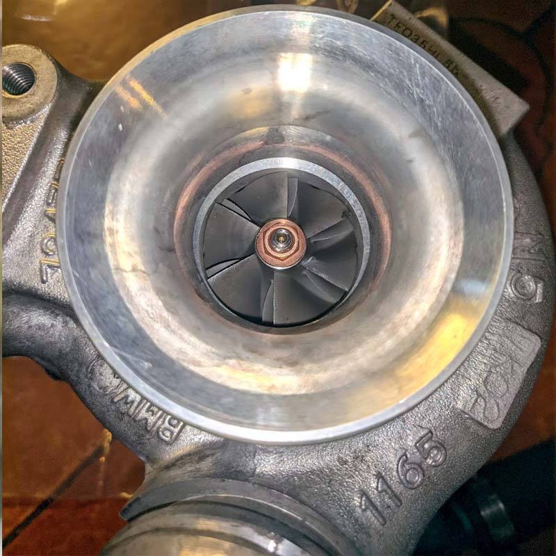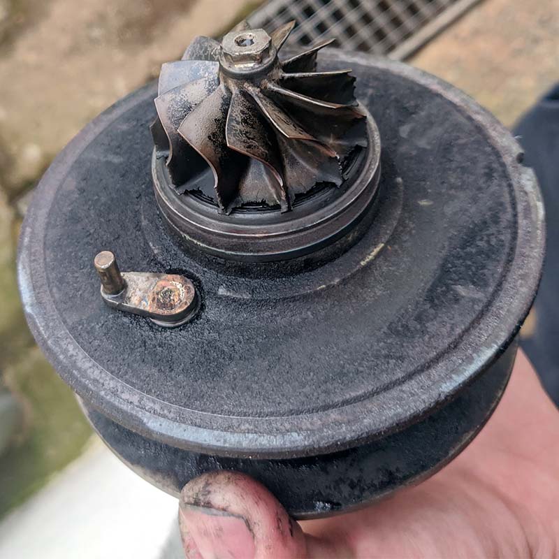 Diagnostique : jeu axial excessif dans la turbine et sifflement. Au lieu de changer le turbo complet (très cher), j'ai remplacé uniquement le CHRA (la cartouche centrale avec les turbines), une opération de précision.